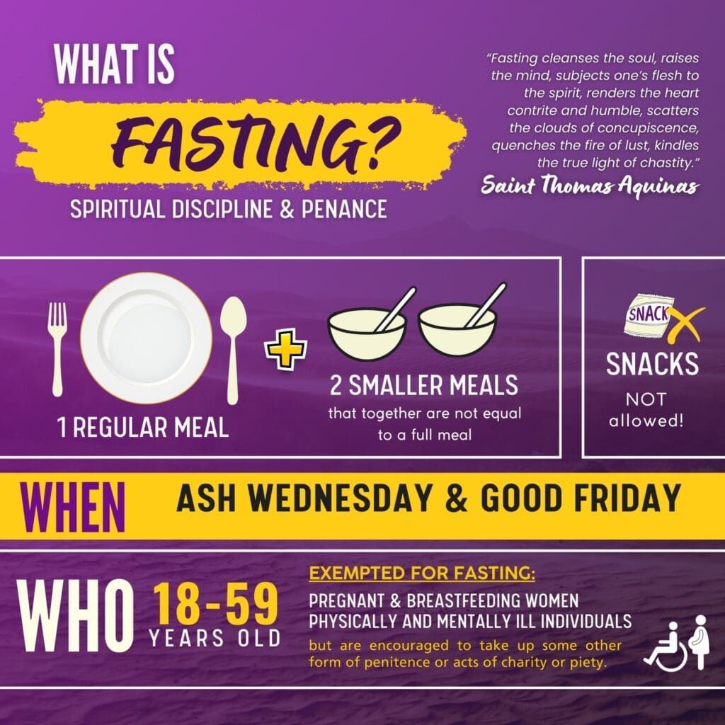 Fasting sharpens our spiritual focus, expresses sorrow for our sins, unites us with Christ’s suffering on the Cross, and prepares us to celebrate Easter with renewed hearts.